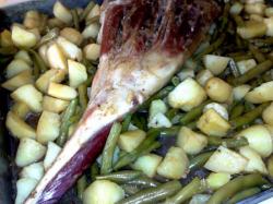 -Au bout d'1/2 heure de cuisson du gigot, vous ajoutez vos pommes de terres crues ainsi que vos haricots verts précuits dans le plat de cuisson où se trouve le gigot (je vous avais bien dit de prévoir un très grand plat!!!) et vous ajoutez de l'eau de telle sorte que vos pommes de terre en soient recouvertes.